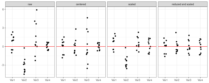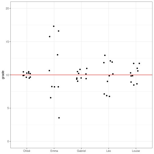 class: center, middle, inverse, title-slide # Introductory statistics ### Nathalie Vialaneix & Sandrine Laguerre ### Toulouse, March 14-16 – 2022 --- <!-- Section 1: introduction, definition, types of variables --> ## An elementary map of statistics .center[<img src="img/statistics-map.png" height="500">] --- ## An elementary map of statistics .center[<img src="img/statistics-map-filled.png" height="500">] --- ## Before you start: tidy your data! .left[<img src="img/real-data.png" height="300">] --- ## Before you start: tidy your data! .left[<img src="img/real-data.png" height="300">           <img src="img/clean-data.png" height="300">           <img src="img/tidy_data.png" width="350">] **clean data**: one sample in each row, one variable in each column, one value in each cell .center[“Like families, tidy datasets are all alike but every messy dataset is messy in its own way.“] <font size="3">Hadley Wickham (2014) Tidy Data. Journal of Statistical Sofware, 59(10).</font> --- ## Types of variables * numeric (discrete or continuous) * non numeric (ordered or not) <img src="img/warning.png" height="50"> how things are encoded! .right[<img src="img/clean-data.png" height="350">] --- class: center, inverse, middle <!-- Section 2: univariate statistics (and graphics) --> ## Univariate statistics --- ## Statistics (e.g., numerical characteristics) ### Purpose       summarize a series of values by one numeric value -- ### central characteristics       *indicateurs de tendance centrale* ### dispersion characteristics       *indicateurs de dispersion* --- ## Central characteristics - **Mean** (**Moyenne**): sum of the observed values divided by the number of observations: `\(\overline{X} = \frac{1}{n} \sum_{i=1}^n x_i\)` - **Median** (**Médiane**): value that splits the sample into two subsamples with equal sizes - **Mode** (**Mode**): most frequently observed values - **Quartiles** (**Quartiles**): 3 values that split the sample into 4 equal size subsamples - **Deciles** (**Déciles**): 9 values that split the sample into 10 equal size subsamples - **Percentiles** (**Percentiles**): 99 values that split the sample into 100 equal size subsamples - **Quantiles** (**Quantiles**): generalize the others --- ## Never heard of percentiles? .center[<img src="img/carnet-sante.png" height="500">] --- ## Mean and median: the mean is not robust! How to increase the mean salary in a company? -- * increase all salaries of `\(x\)`\% * increase the salary of the most well paid person * suppress a few jobs with low salaries --- ## Are central characteristics enough? <!-- --> 10 marks for 5 students: same mean, same median --- ## Dispersion characteristics * **variance**: average squared distance to the mean `\(\mbox{Var}(X) = \frac{1}{n} \sum_{i=1}^n (x_i - \overline{X})^2\)` and **standard deviation** (*écart type*): `\(\sigma_X = \sqrt{\mbox{Var}(X)}\)` -- <br> <br> * **range** (*étendue*): difference between the largest and the smallest values * **inter-quartile range** (*écart inter-quartile*): difference between the 1st and the 3rd quartiles (half of the observations lie between these two quantities) --- ## A few properties for the standard deviation * positive (or null if all the observations have the same value) * does not change when values are translated * sensible to extreme values (like the mean) * expressed in the same unit than the original variable (like the mean) <br> <br> -- **Consequences** * mean and standard deviation can be added (confidence interval) * they can also be divided: `\(\mbox{CV}(X) = \frac{\sigma_X}{\overline{X}}\)` (*coefficient de variation*) can be used to compare the respective variability of two series --- ## Example of the impact of variability « **Les filles brillent en classe, les garçons aux concours** *LE MONDE | 07.09.09 - Article paru dans l'édition du 08.09.09. Philippe Jacqué* Elles obtiennent de meilleurs résultats en cours de scolarité, mais réussissent moins bien les concours des meilleures grandes écoles que les hommes. [...] Pour vérifier [cette hypothèse], trois économistes - Evren Örs, professeur à HEC, Eloïc Peyrache, directeur d'HEC, et Frédéric Palomino, ancien de l'école parisienne et actuel professeur associé à l'Edhec Lille - ont étudié à la loupe les résultats obtenus entre 2005 et 2007 au concours d'admission en première année d'HEC, une des écoles de management les plus réputées. [...] « D'un point de vue technique, il semble que la structure du concours HEC crée d'avantage d'hétérogénéité chez les hommes que chez les femmes », estime M. Peyrache. Si, « en moyenne », les performances des hommes et des femmes sont similaires, « les notes des femmes sont concentrées autour de la moyenne, tandis que celles des hommes sont très dispersées avec beaucoup de très bonnes notes et de très mauvaises. Mécaniquement, quand on sélectionne les 380 premiers résultats, on a un peu plus d'hommes ». --- ## Standard modifications of data * **binarization of a numeric variable** (*discrétisation*): transform a numeric variable into a factor by: <ul> <li>creating intervals of equal width</li> <li>creating intervals of equal number of observations (<em>how to do that?</em>)</li> <li>other...</li> </ul> -- <br> <br> Which solution sounds the best? What are the advantages/drawbacks of such a transformation? --- ## Standard modifications of data * **centering and scaling (to unit variance)** (*centrage et reduction*), often called **Z-score**: <ul> <li>centering: removing the mean</li> <li>scaling: dividing by the standard deviation</li> </ul> `\(z_i = \frac{x_i - \overline{X}}{\sigma_X}\)` <br> After centering and scaling, the mean of the variable is 0 and its standard deviation is 1. <!-- --> --- ## Log transformations <!-- --> * useful for asymetric distribution to make the variable fit a Gaussian distribution (after transformation) `\(\Rightarrow\)` often performed before tests * useful for ra